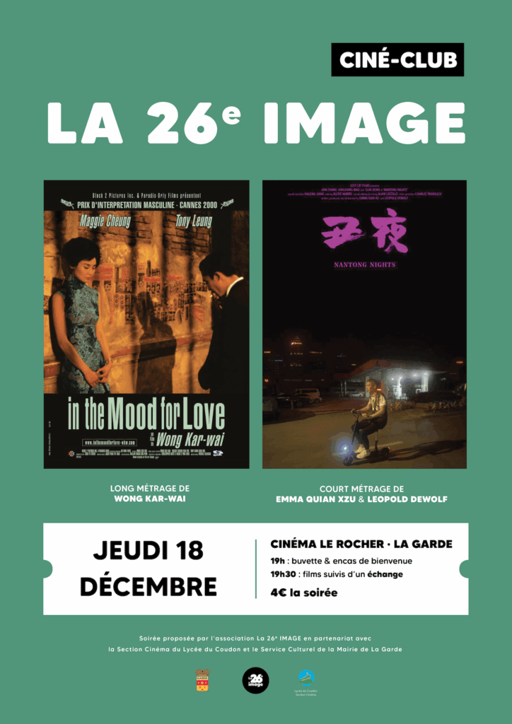 Ciné-club SAISON 25/26 Prochain Ciné-club JEUDI 18 DÉCEMBRE « In the mood for love » de Wong Kar-wai+« Nantong nights » de Emma Qian Xu et Léopold Dewolf Cinéma du Rocher · La Garde (83) À venir VENDREDI 9 JANVIERJEUDI 5 FÉVRIERJEUDI 12 MARSVENDREDI 10 AVRILJEUDI 7 MAI Évènements passés