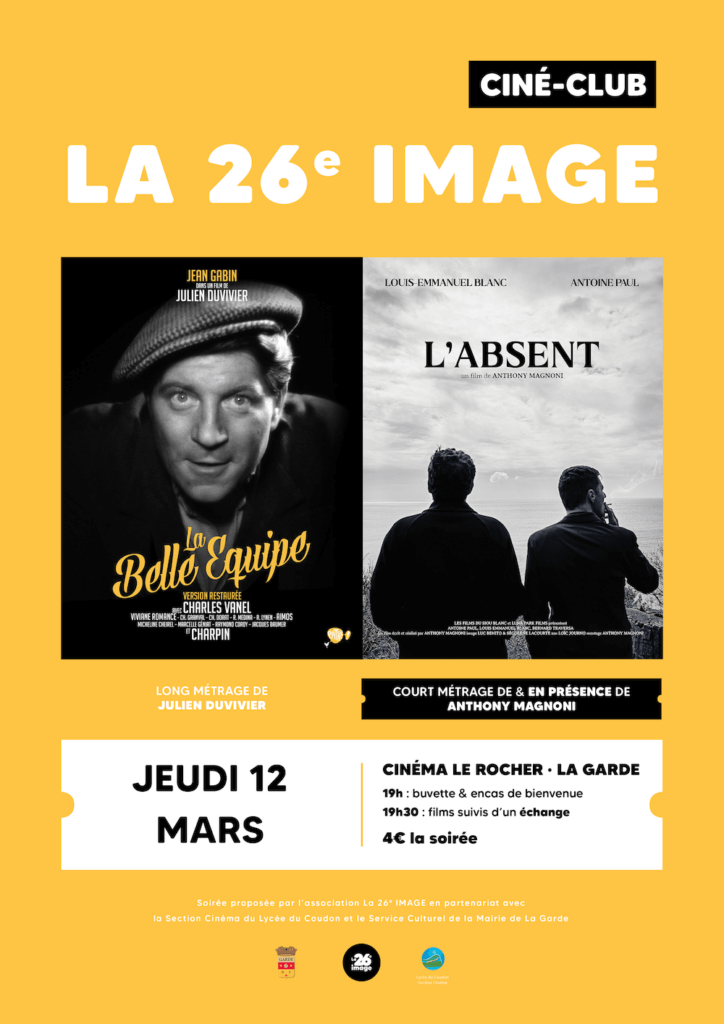 Ciné-club SAISON 25/26 Prochain Ciné-club JEUDI 12 MARS « La Belle Équipe » de Julien Duvivier+« L’absent » de Anthony Magnoni Cinéma du Rocher · La Garde (83) À venir VENDREDI 10 AVRILJEUDI 7 MAI Évènements passés